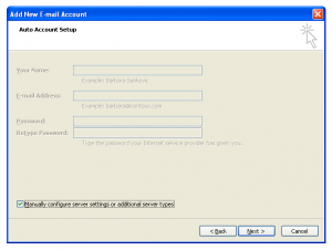 Then, check “Manually configure server settings or additional server types” and press Next… [Outlook 2003: this step is not needed.]