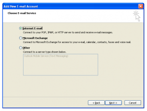 Choose “Internet E-mail” and press Next… The Manual configuration screen will appear… Fill it with the following data: [Outlook 2003: the Manual configuration screen will appear directly without this step, just fill it. You must not check the “Require logon using Secure Password Authentication (SPA)” since it doesn’t seem to be correctly supported for Outlook 2003.]