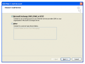 Here you must choose “Microsoft Exchange, POP3, IMAP or HTTP” and press Next… [Outlook 2003: just choose POP3.]